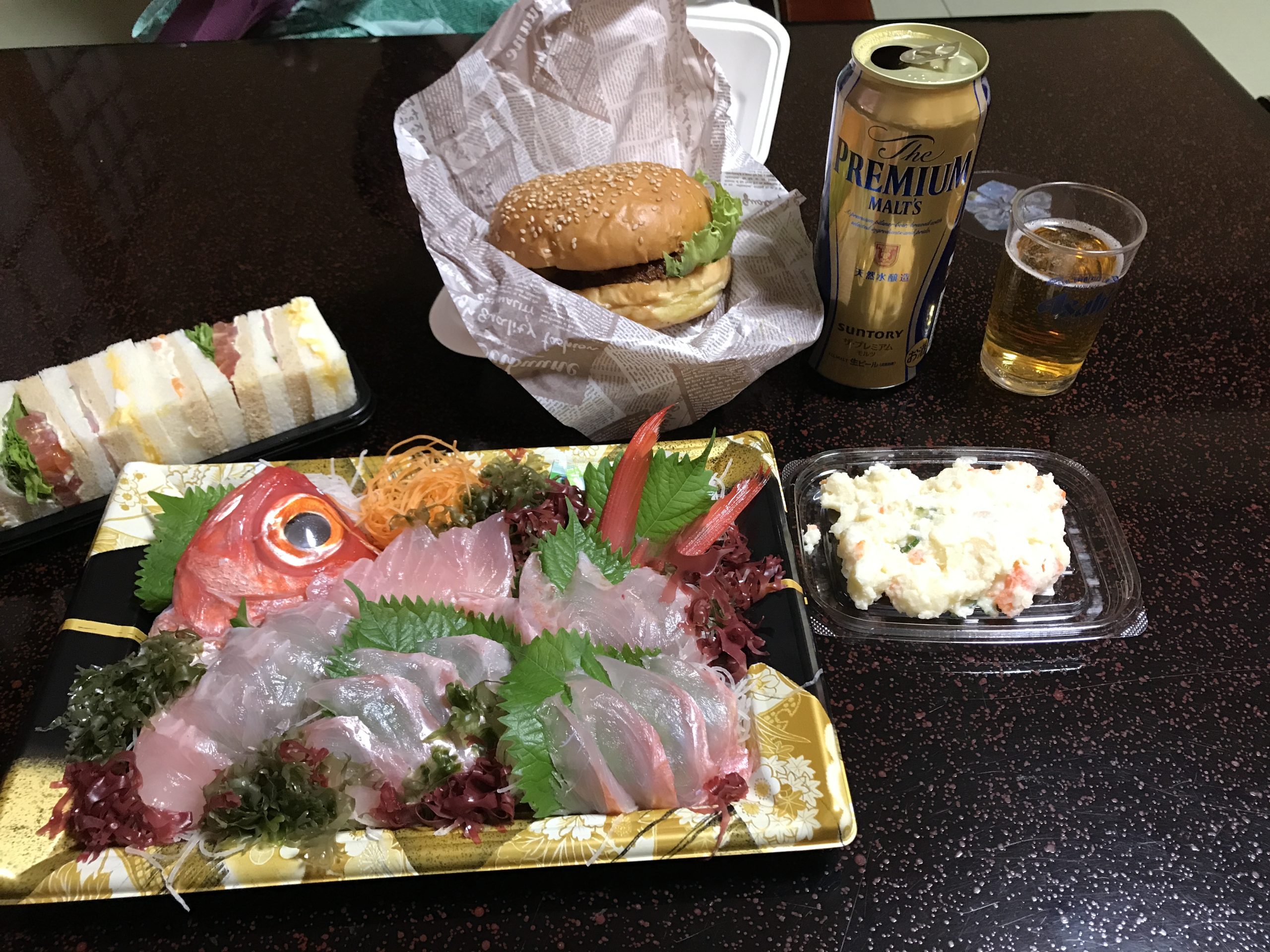 キンメダイバーガーを買って、途中の東急ストアによってお刺身を買い、